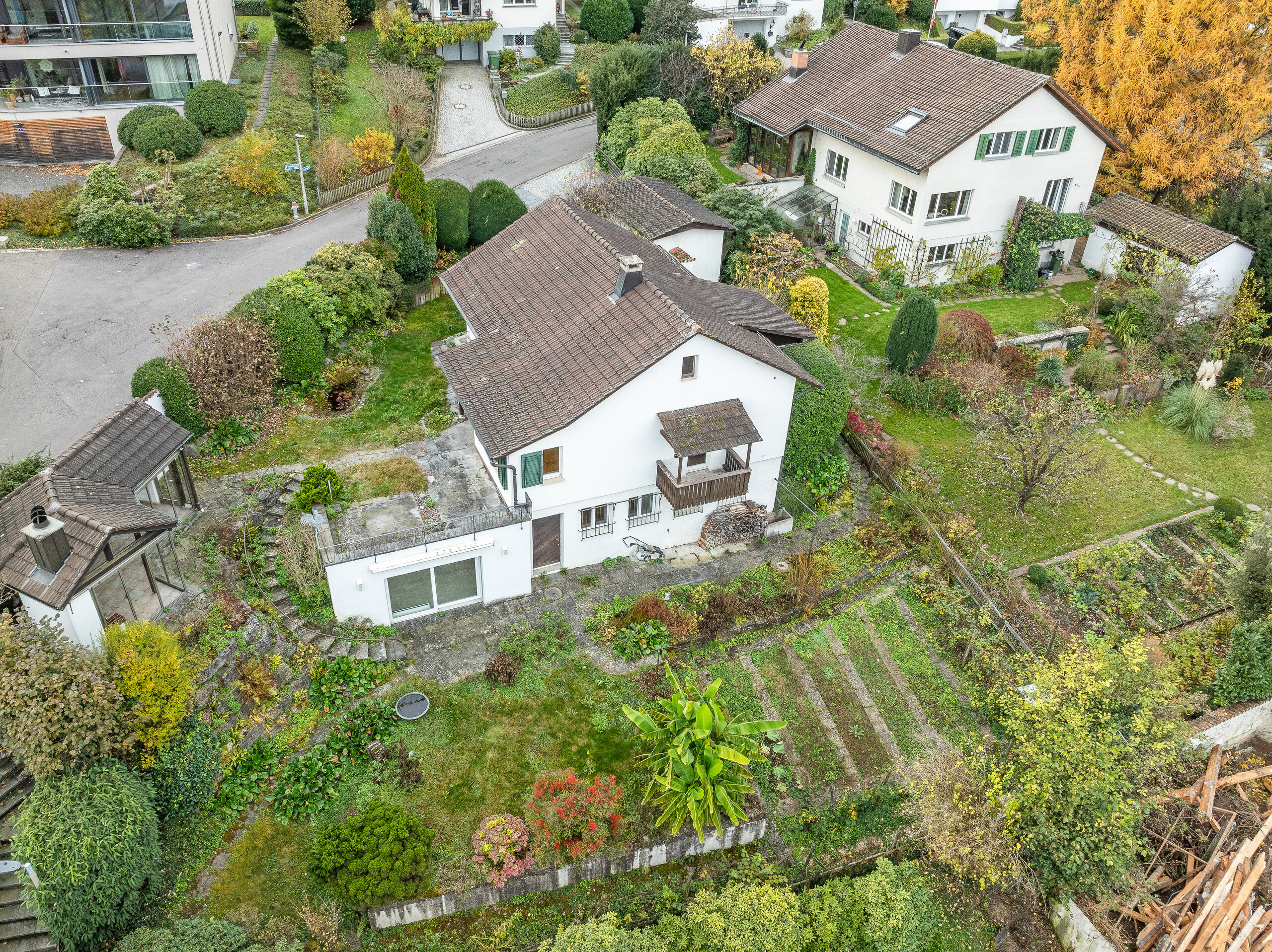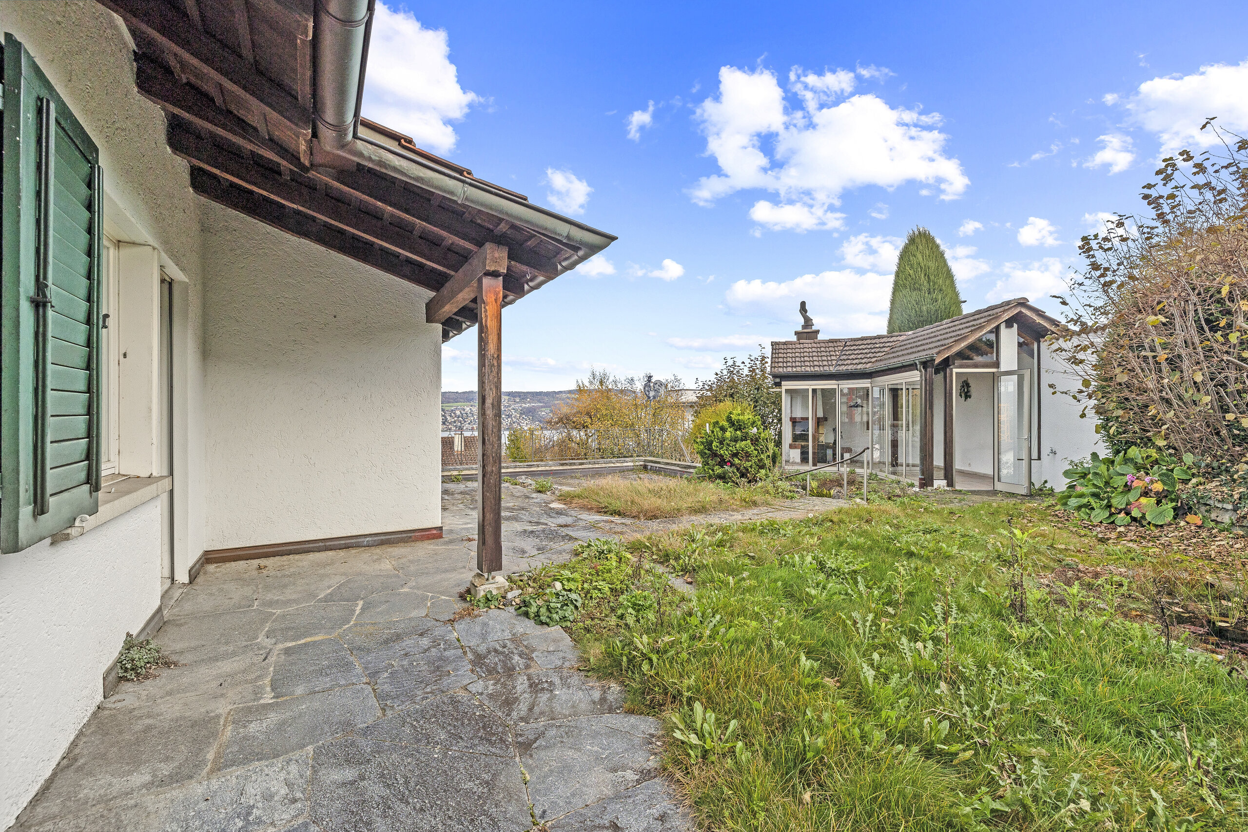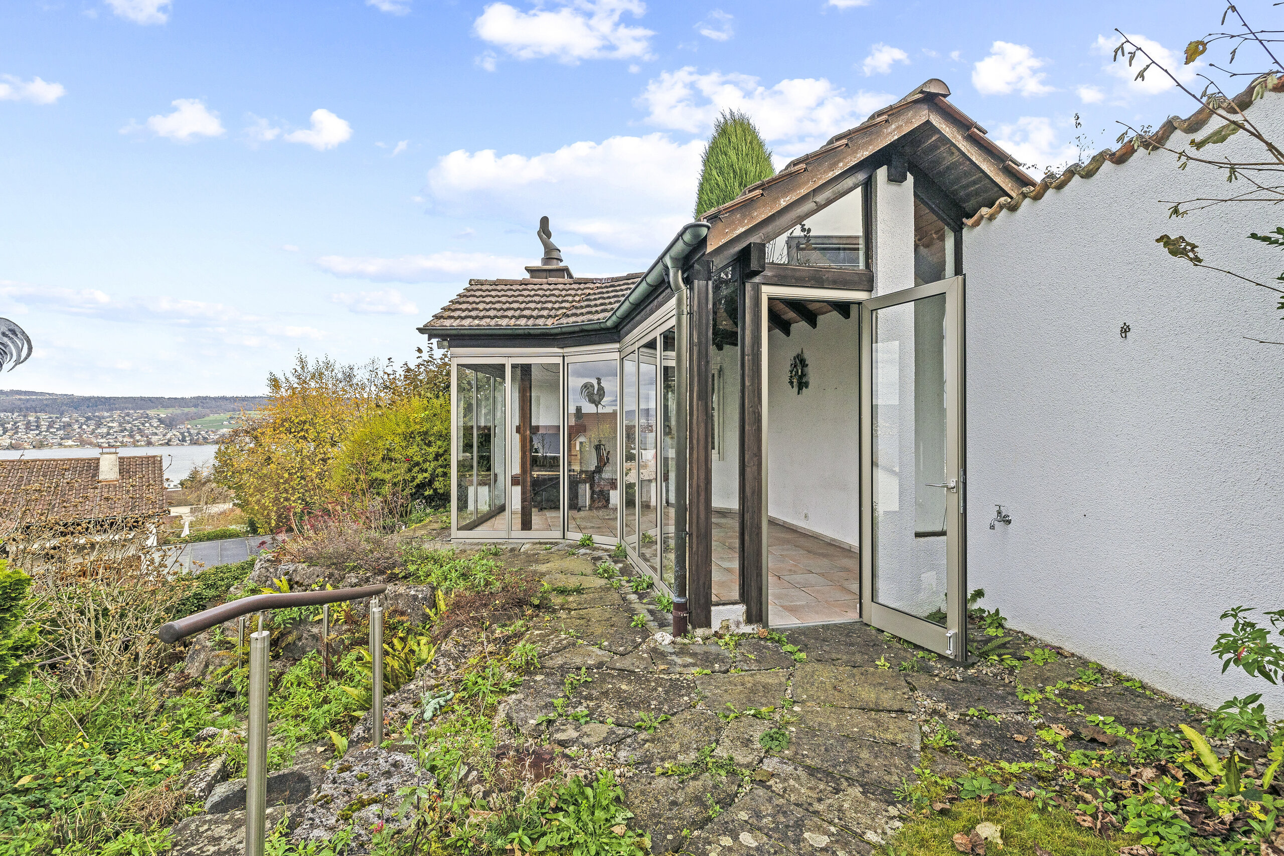 In Thalwil we rent this charming, detached family home with beautiful garden and breathtaking views over Lake Zurich. With a generous total usable area of 214 m², distributed over 5.5 rooms, ancillary rooms and two floors, the house offers plenty of space for families and couples with sophisticated requirements.