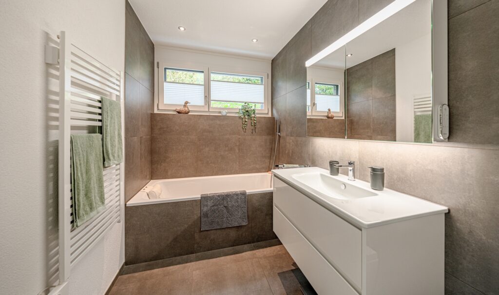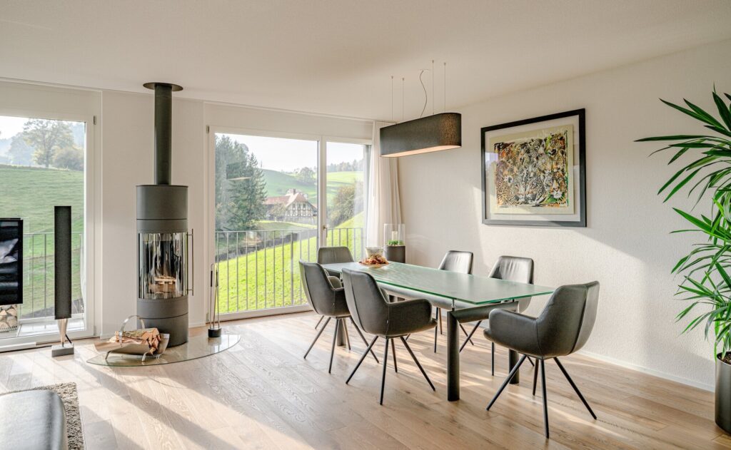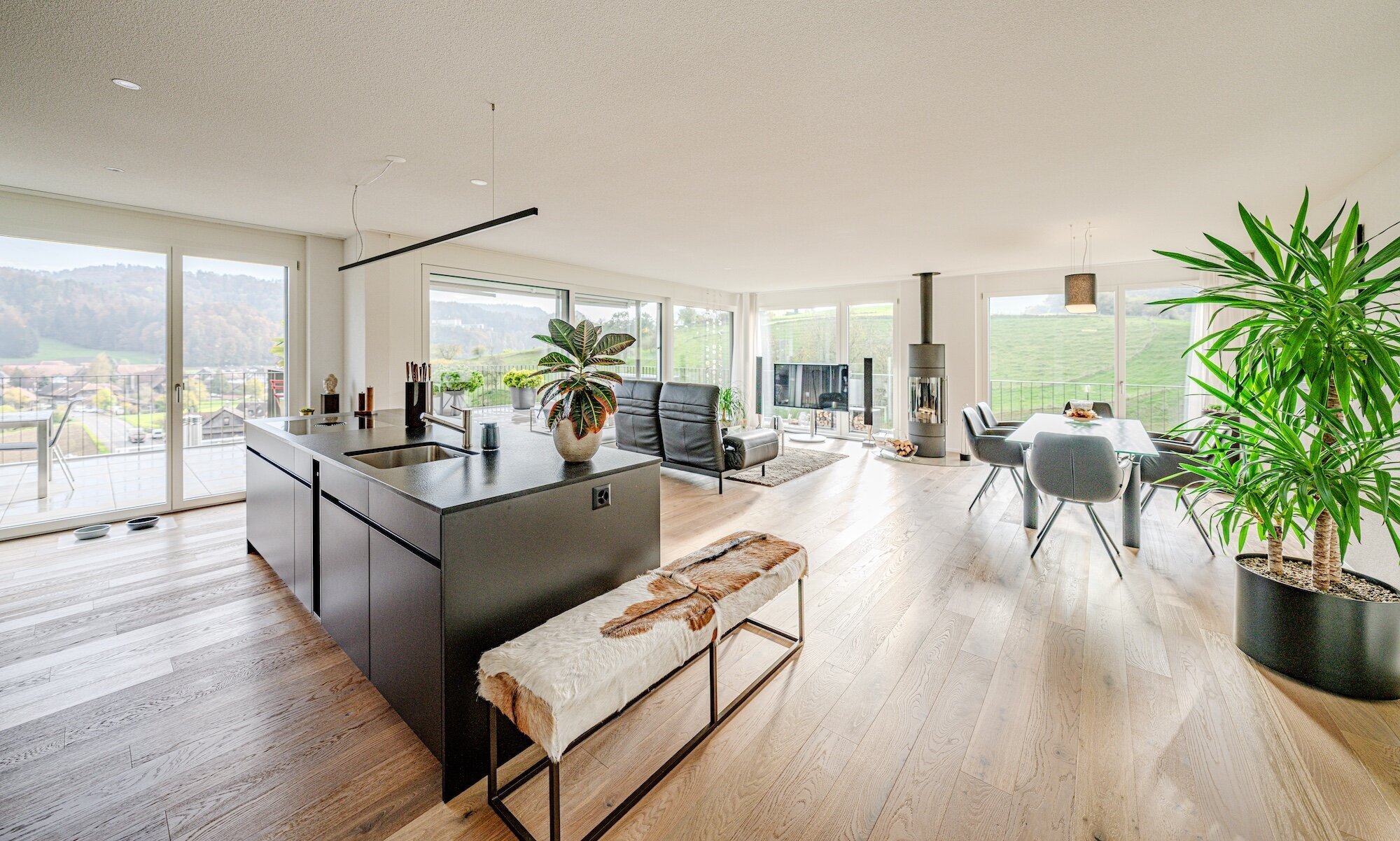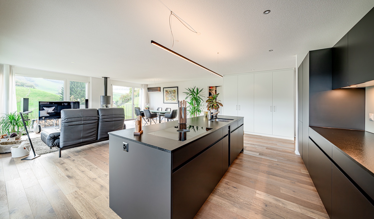 The open living and dining area with floor-to-ceiling windows creates a light-flooded ambience, while the cozy Swedish stove provides warmth and atmosphere . The elegant kitchen in anthracite with cooking island offers plenty of storage space and sets stylish accents.