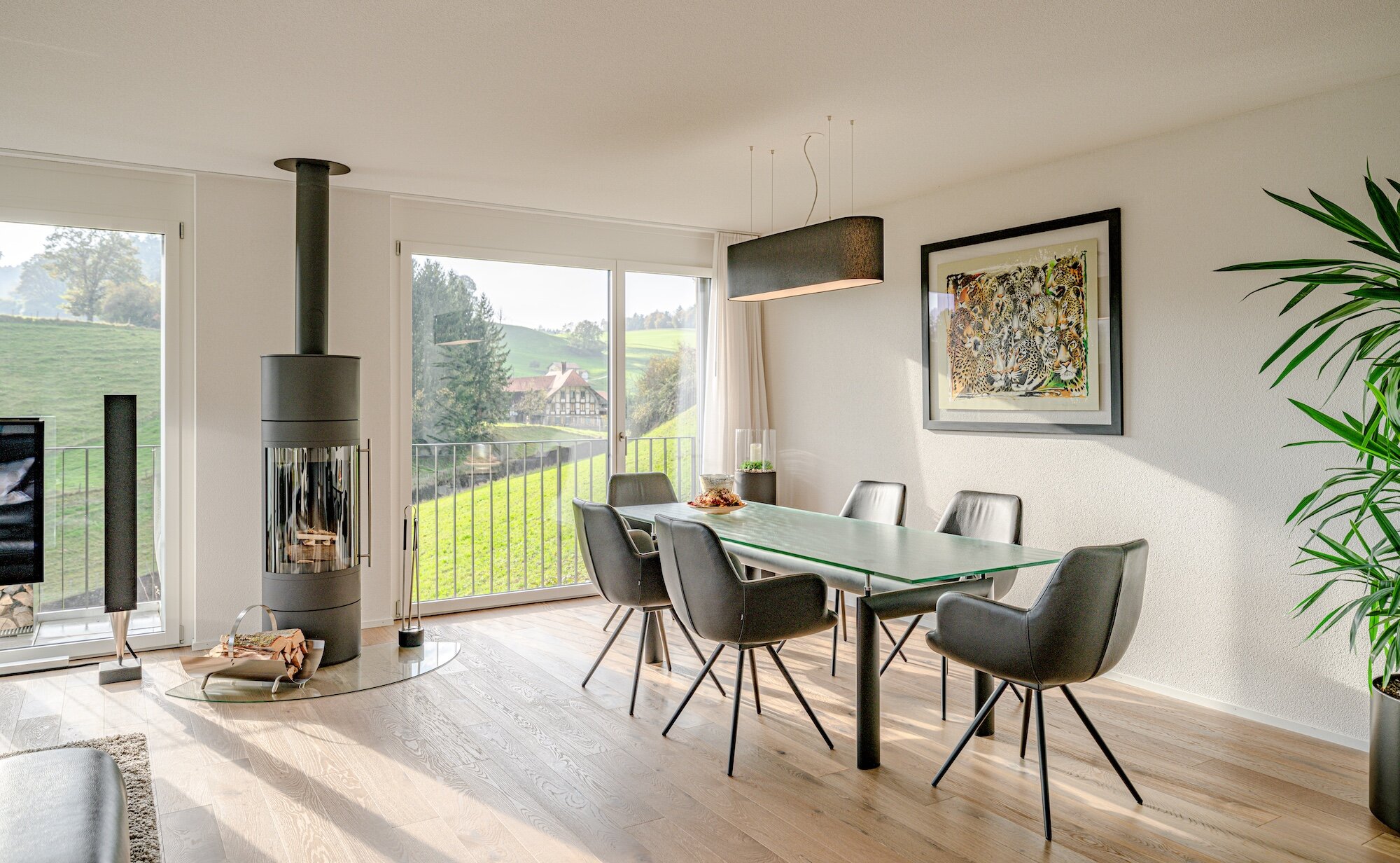 - Open living and dining area with large, floor-to-ceiling windows and cozy Swedish stove.