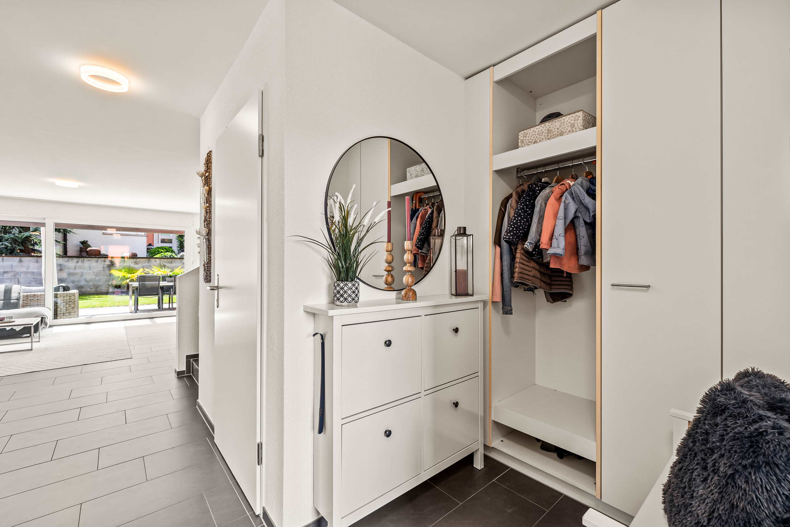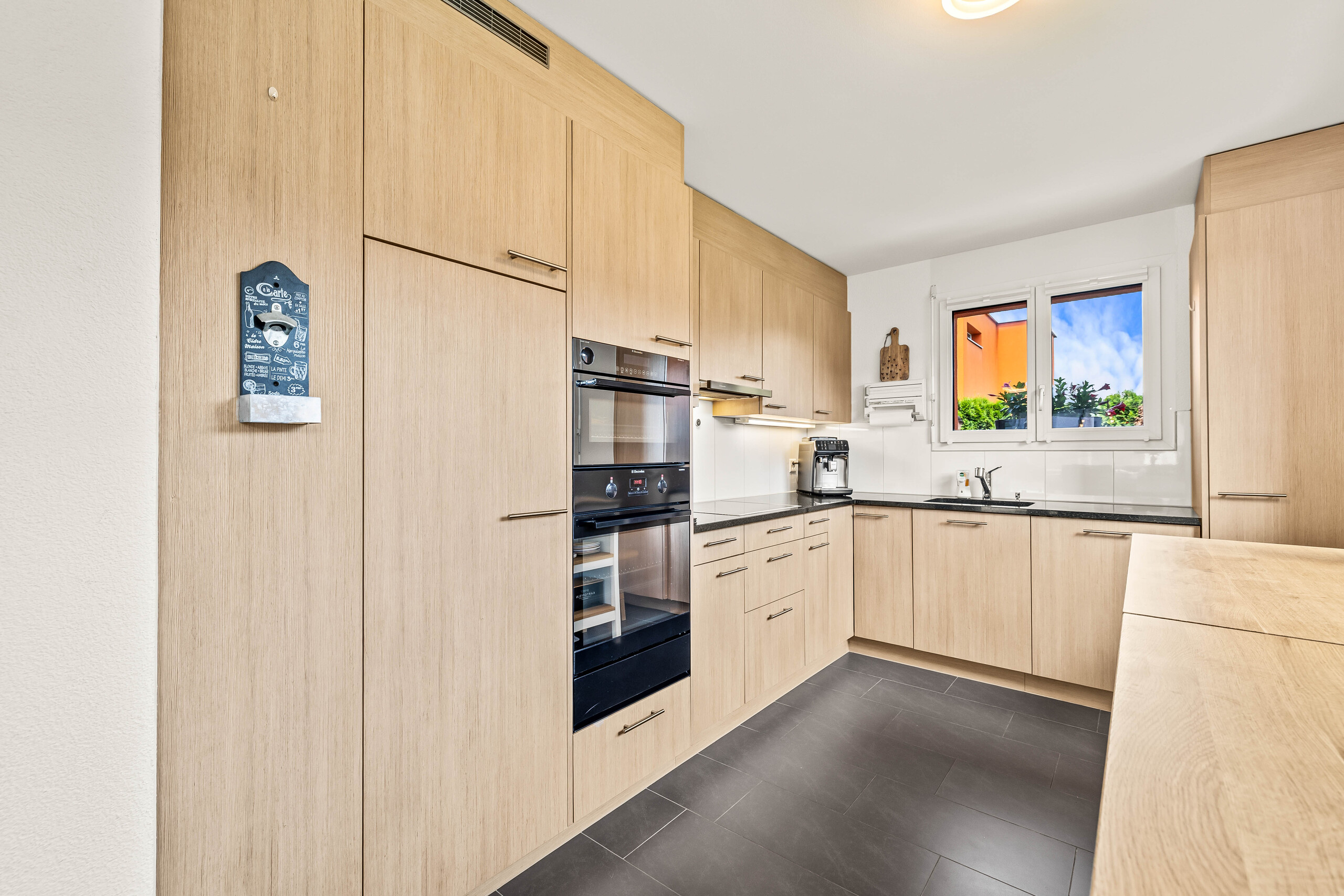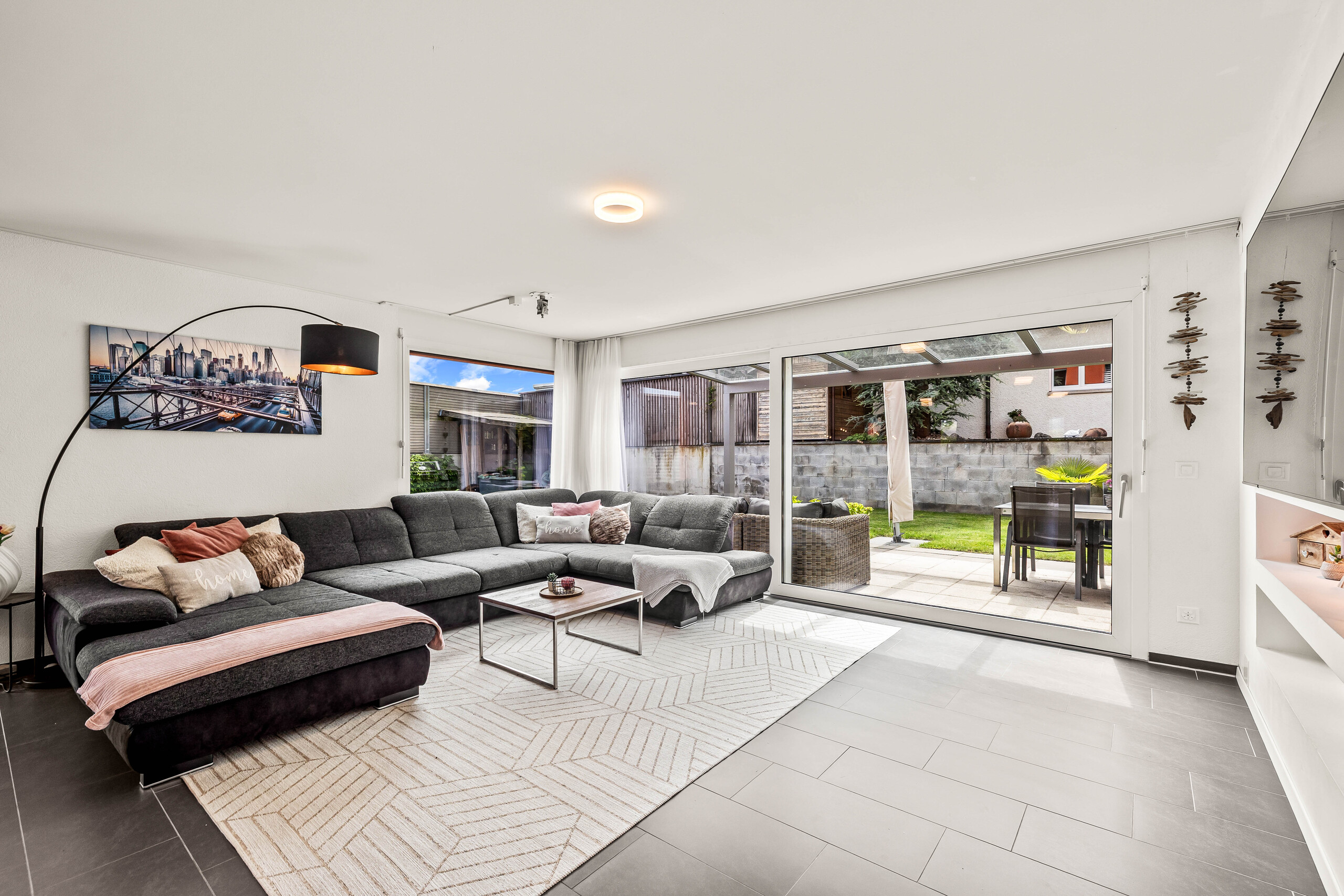 The open living and dining area is flooded with light and offers direct access to the terrace and the well-tended garden. The open kitchen with granite top and plenty of storage space blends harmoniously into the living concept . Two neat wet areas - a bathroom with shower/WC and a separate guest toilet - ensure comfort in everyday life.