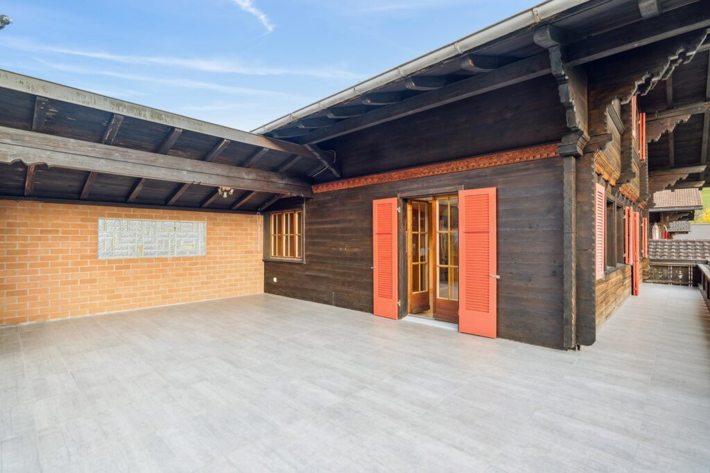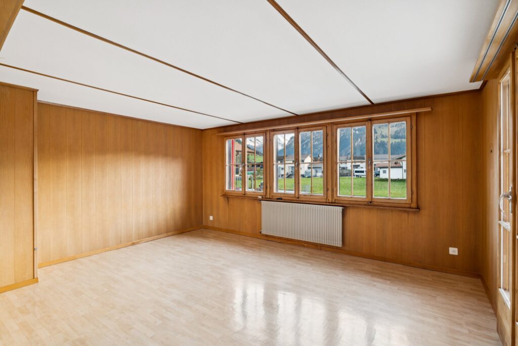The style is unmistakable: a traditional chalet with history, lots of wood and a warm, typical Oberland charm. The solid building fabric creates an optimal basis for a clean renovation and the possibility to modernize the house according to your own ideas . The living area is spacious and bright; from here you have direct access to the large terrace with pergola and beautiful mountain views.
