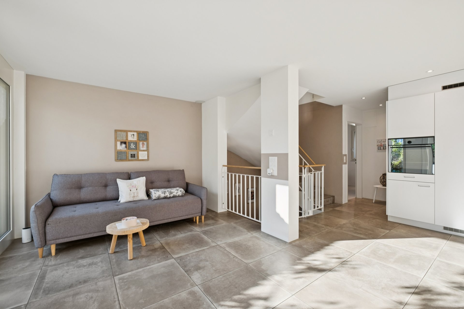 The large, bright cooking, dining and living area opens directly to the covered Garden seating area with adjoining lawn - perfect for relaxing hours in the outdoors. A spacious side room in the basement offers additional uses, be it as a hobby room, office or storage space.