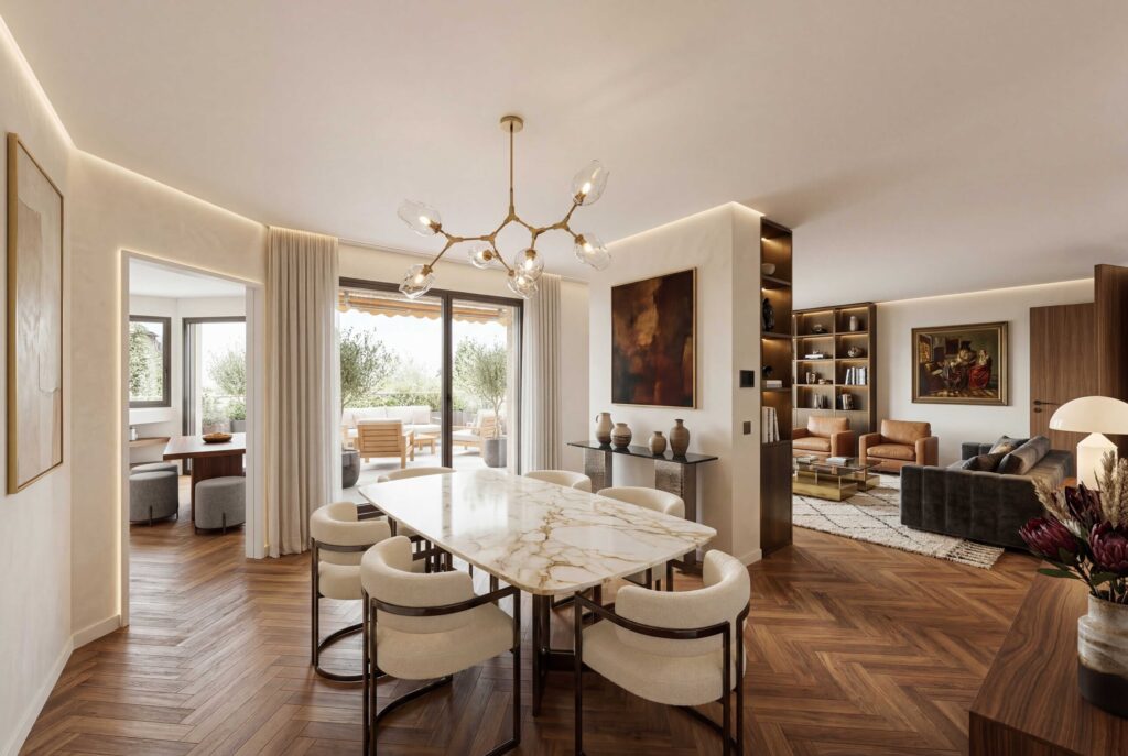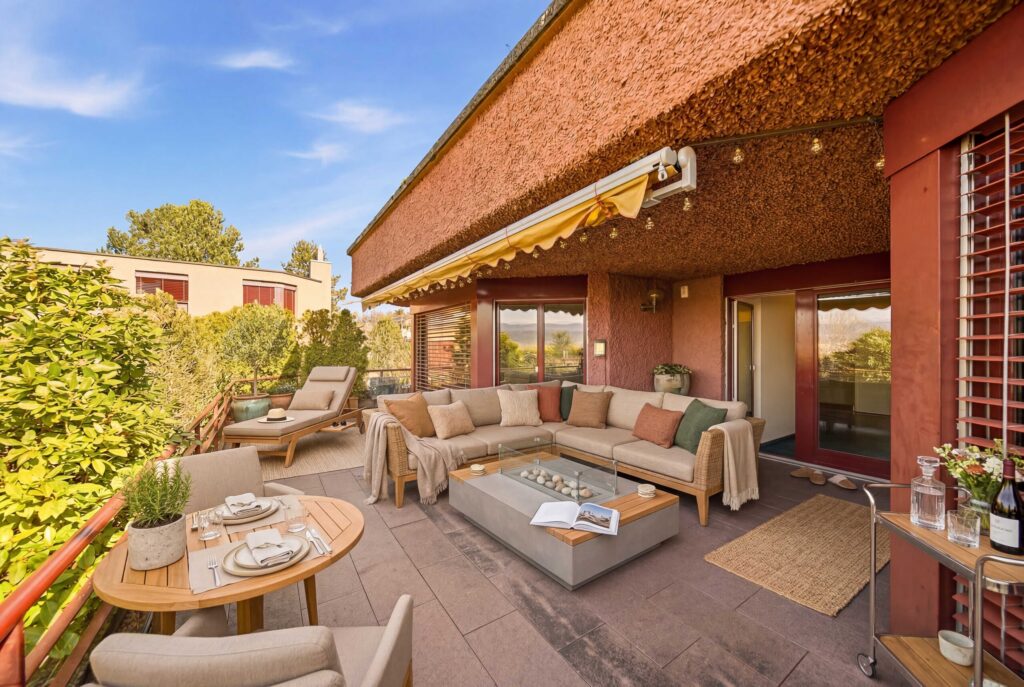 Das Herzstück der Wohnung bildet der weitläufige Wohn- und Essbereich mit grossen Fensterfronten und stilvollem Cheminée. Hier entstehen helle, einladende Räume mit viel Wohnqualität und dem perfekten Rahmen für entspannte Stunden im kleinen Kreis oder gesellige Abende mit Gästen. Direkt angrenzend lädt die grosszügige Sonnenterrasse mit rund 40 m² dazu ein, die schöne Aussicht auf den Zürichsee in vollen Zügen zu geniessen.