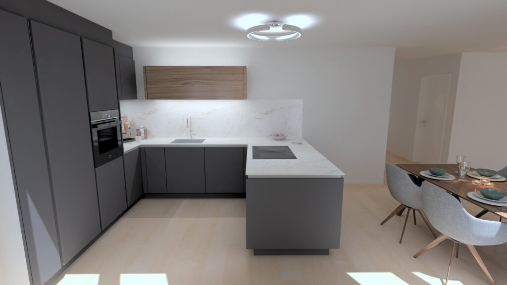 La cuisine ouverte avec revêtement en granit, beaucoup d'espace de rangement et de la place pour une grande table à manger invite à cuisiner ensemble et profiter de .Deux espaces humides - salle de bain/WC et douche/WC - augmentent le confort d'habitation.