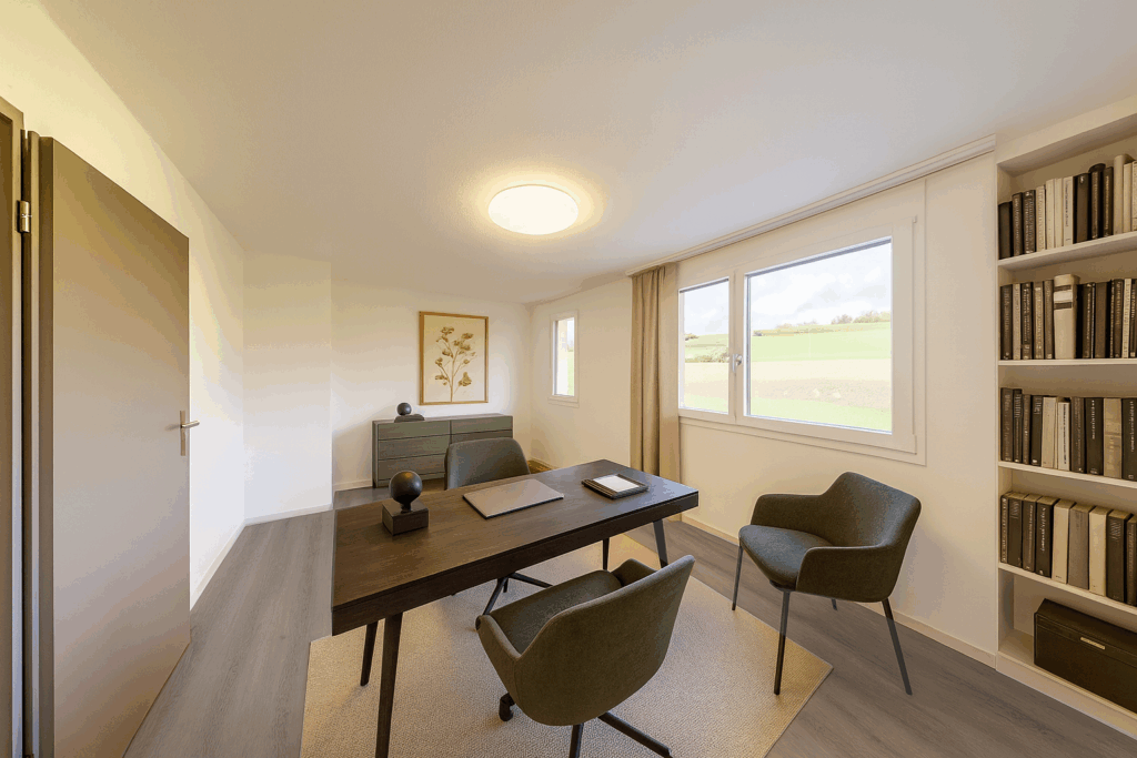 Deux zones humides - une salle de douche/WC ainsi qu un WC pour les invités avec une tour de lavage - intelligemment intégrée assurent un grand confort au quotidien. La grande place assise avec vue sur le jardin soigné avec amour forme une oasis de tranquillité. La pelouse et les plantations variées offrent de multiples possibilités d'aménagement.