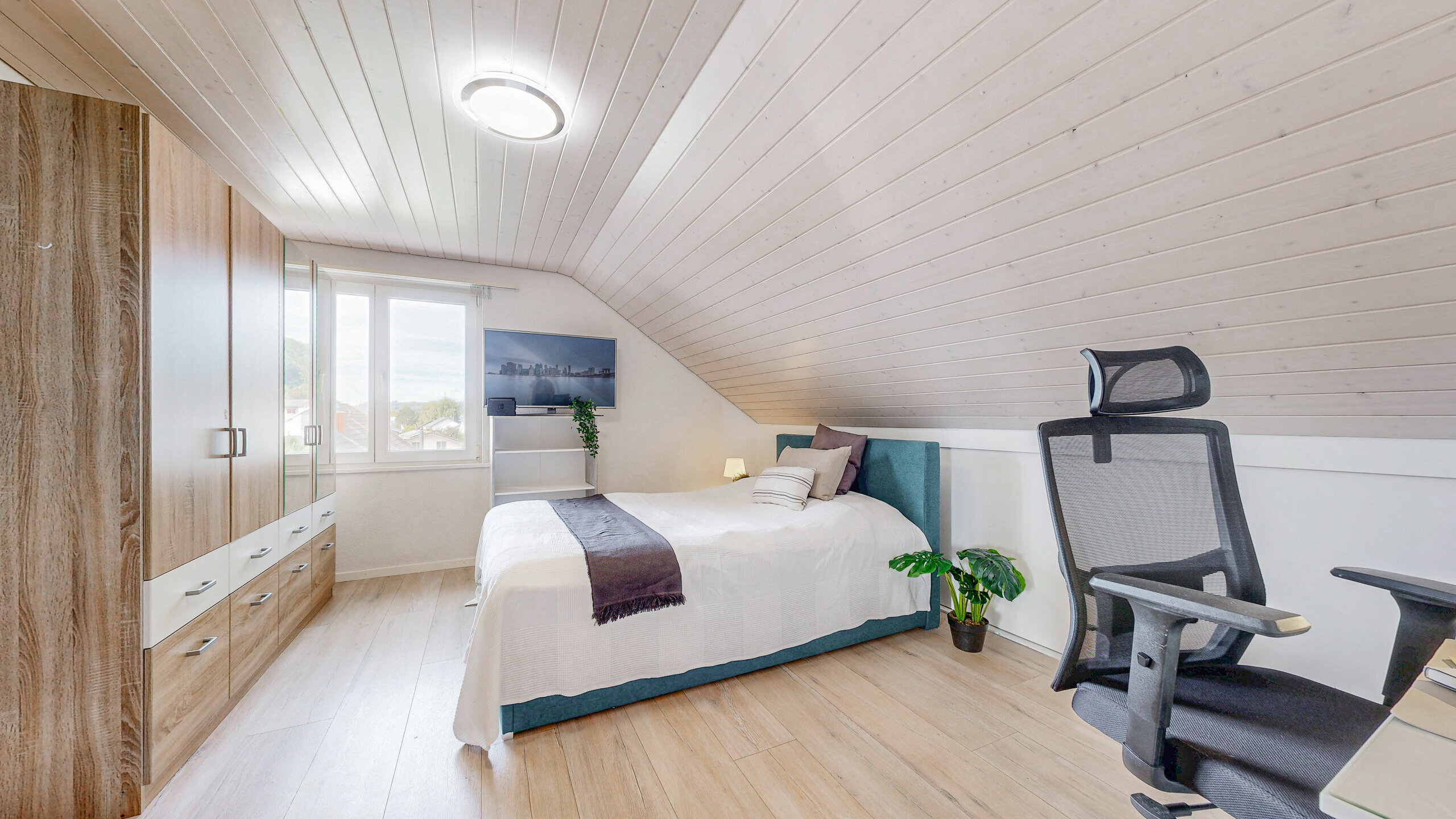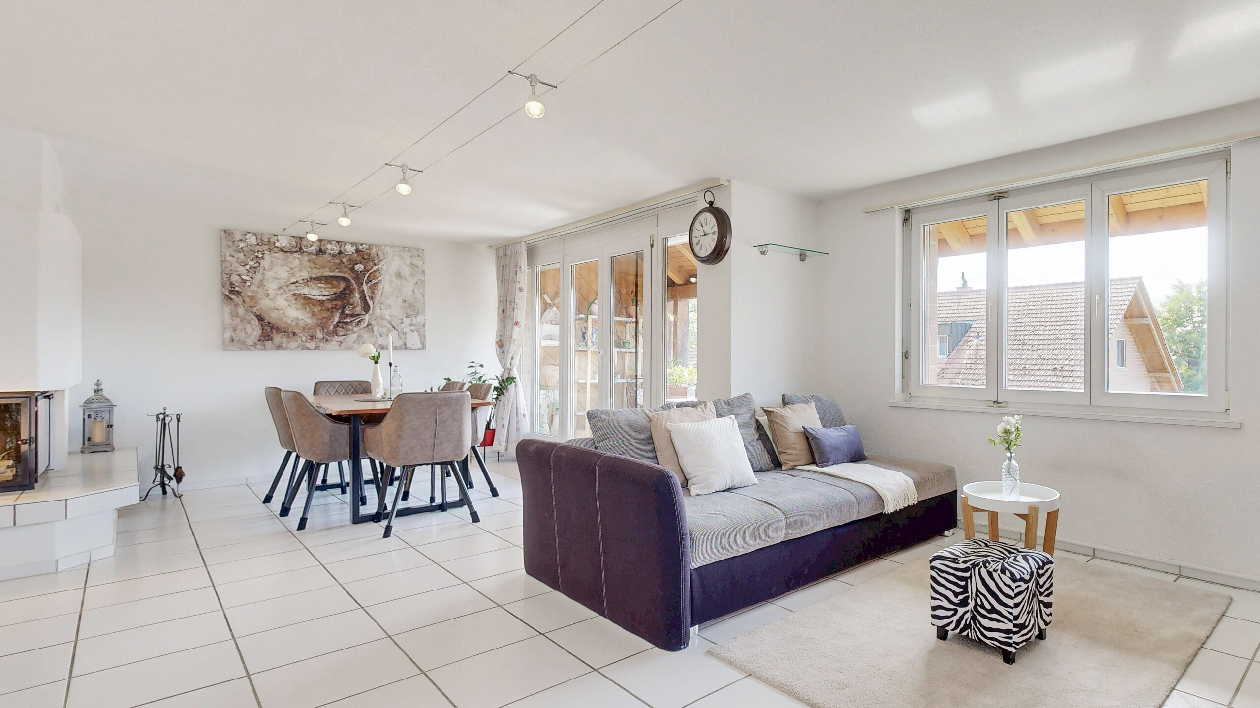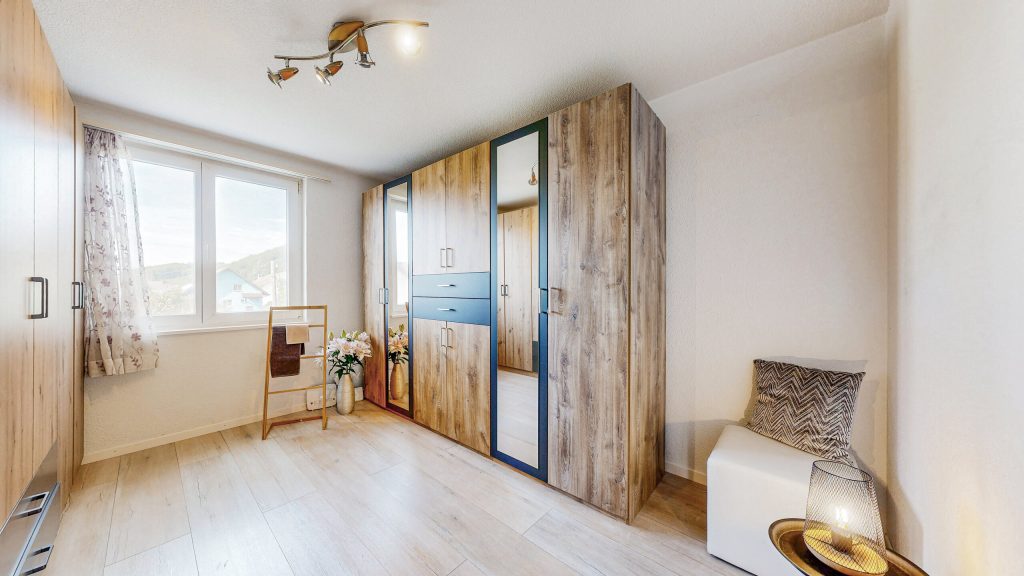 • Agréable à vivre: notamment. a. grâce à l’inclinaison du toit dans les chambres à coucher et à la cheminée dans le salon