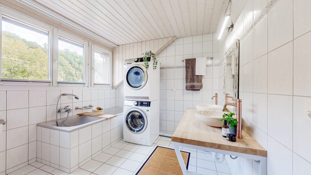 Deux grands espaces humides sont judicieusement répartis sur les deux étages.Au deuxième étage il y a une douche/WC à disposition, au grenier une salle de bain/WC avec sa propre tour de lavage.Un autre plus est la très grande cave en droit spécial, qui peut être utilisée de manière polyvalente que ce soit comme entrepôt, salle de loisirs ou atelier.