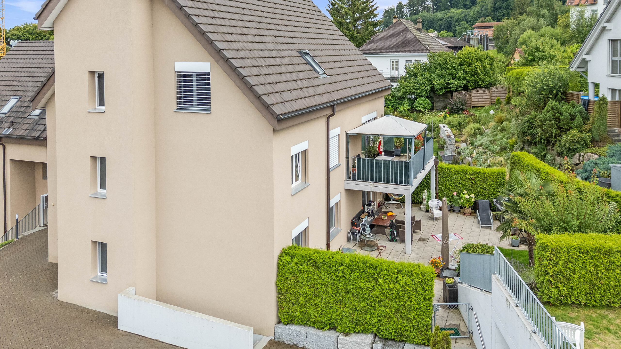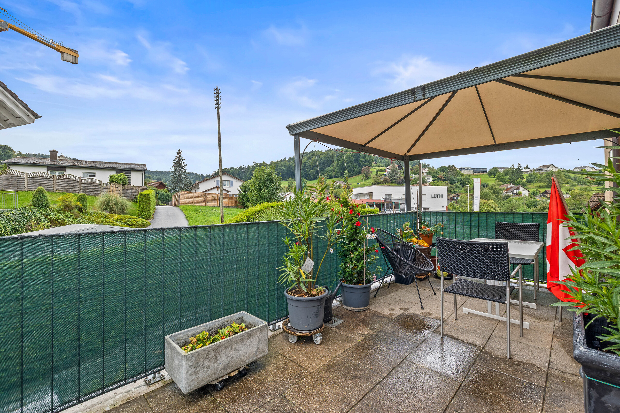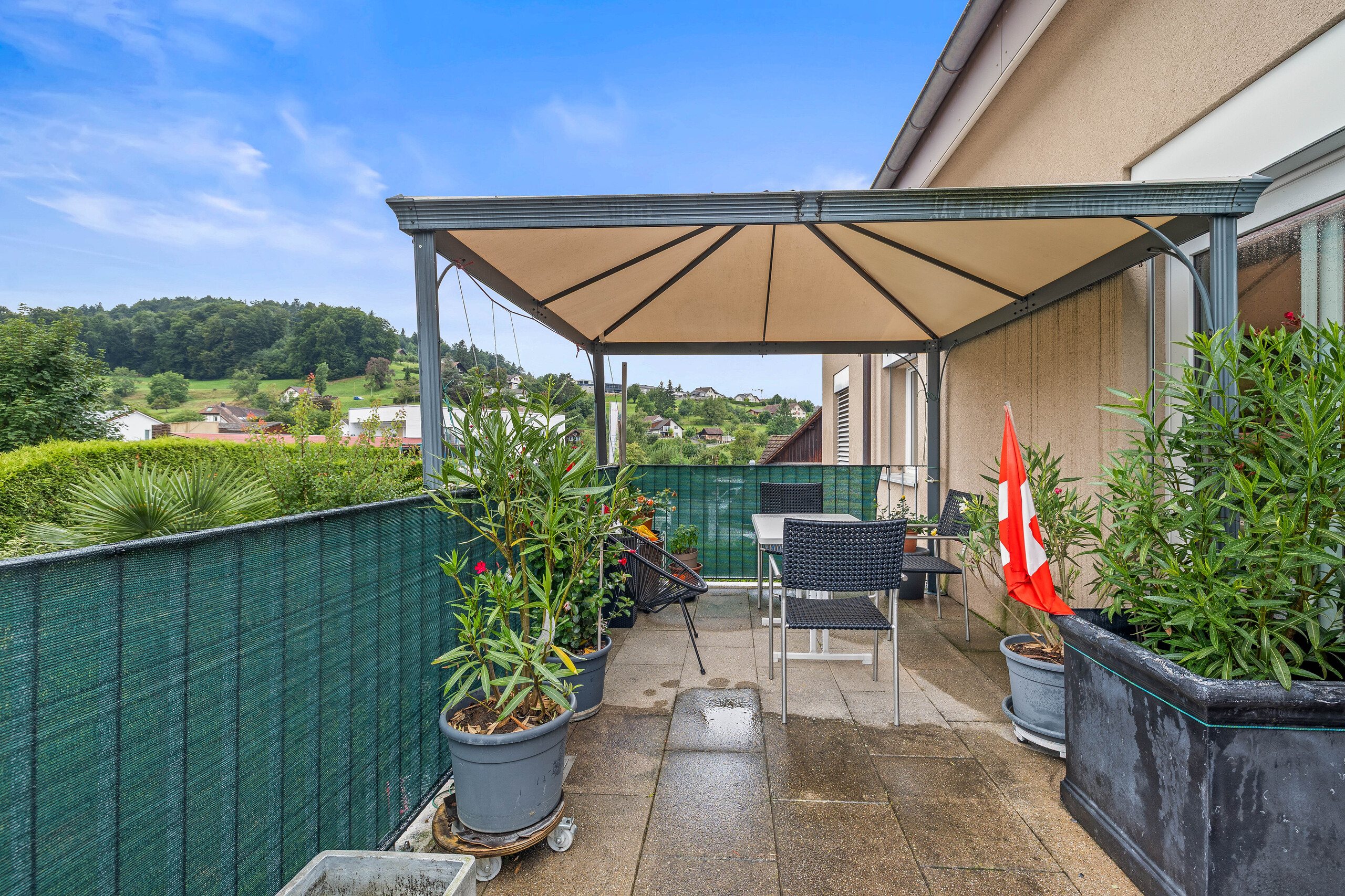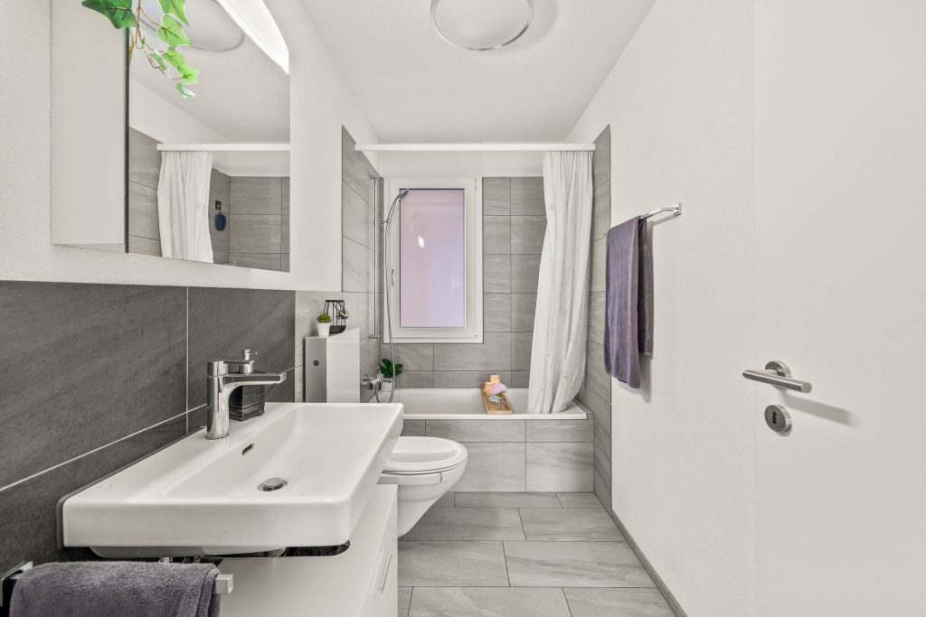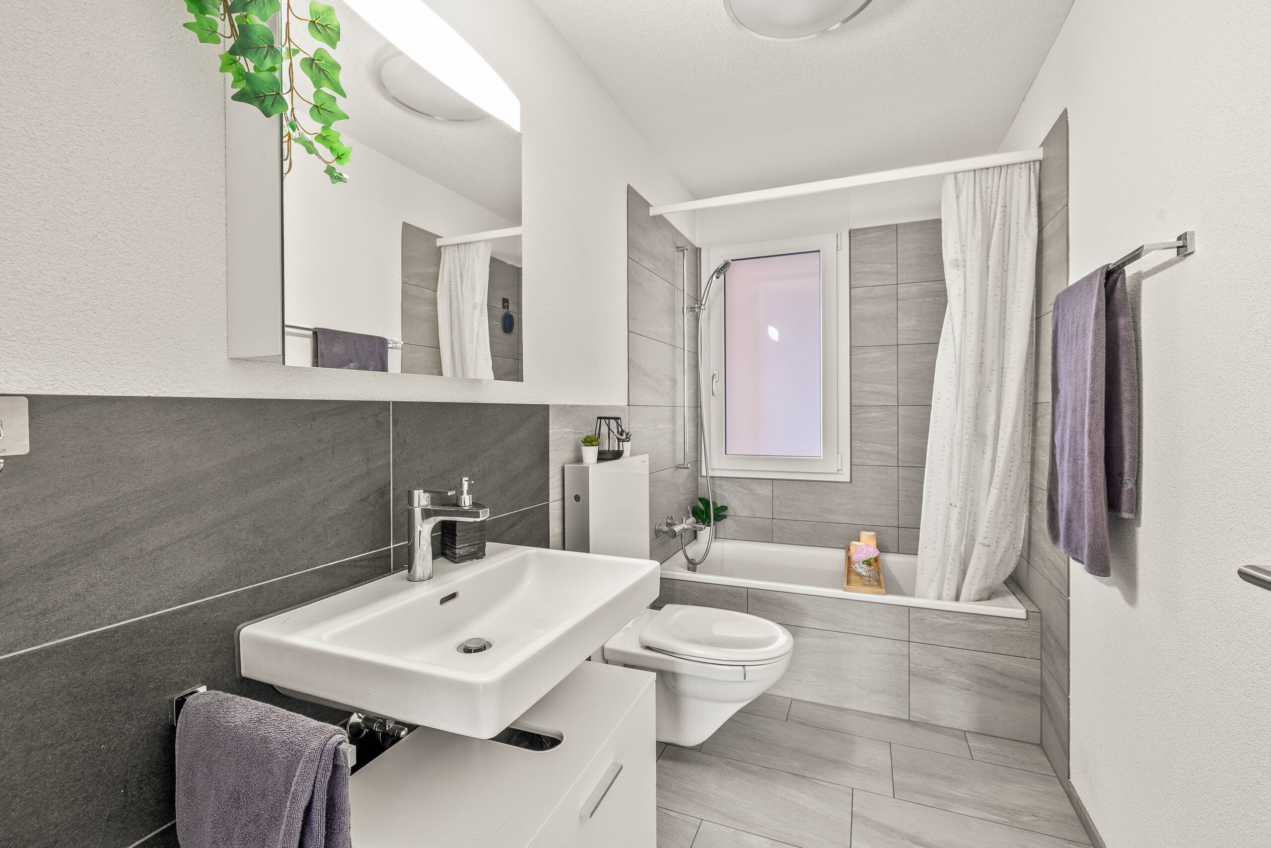 Deux espaces humides assurent un grand confort d'habitation: une salle de bains avec baignoire et WC ainsi qu'une salle de bain séparée avec douche et WC. La terrasse ensoleillée avec une belle vue invite à des heures de détente en plein air et élargit l'espace de vie vers l'extérieur.