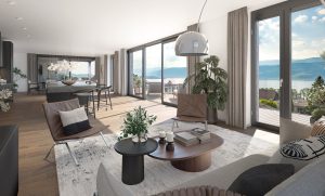 86 m² habitables, finitions modernes,  ;Balcon avec vue latérale sur le lac, V-Zug cuisine, deux salles d'eau fraîchement rénovées, parquet en chêne noble. places de parking avec stations de recharge électrique à louer.