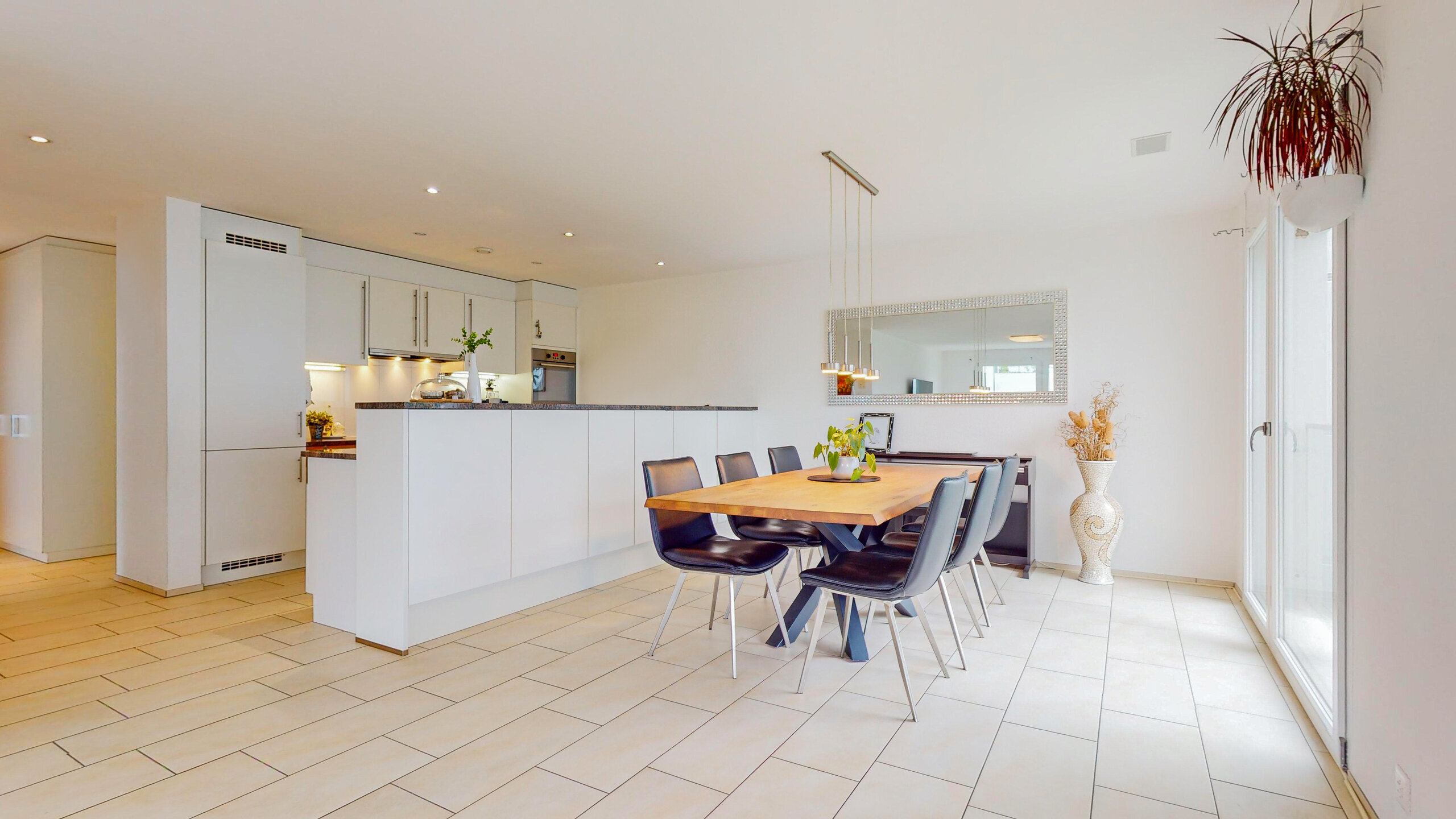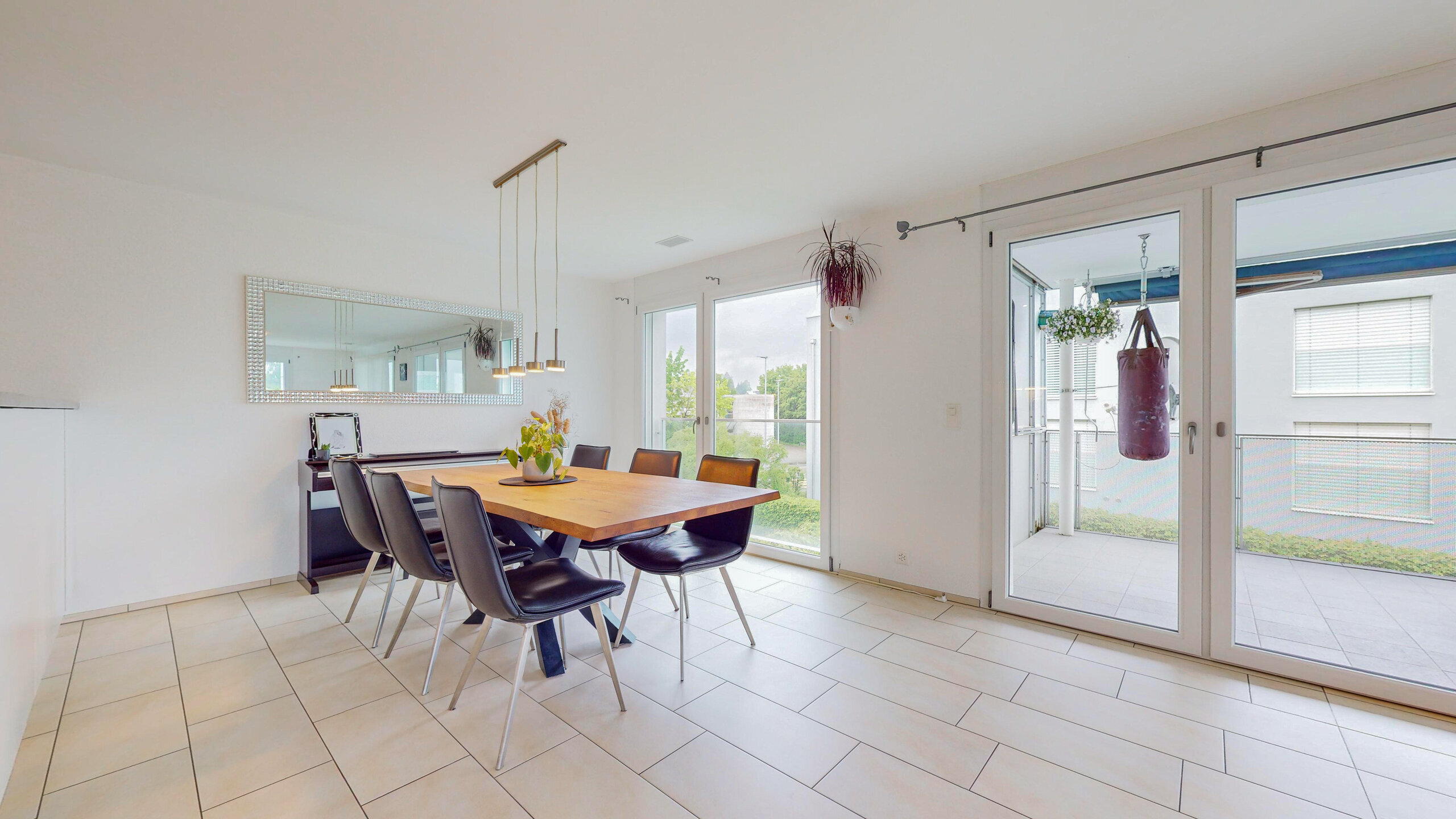 La luminosa, zona giorno e sala da pranzo con finestre a tutta altezza crea un’atmosfera inondata di luce e conduce alla zona pranzo con finestre a tutta altezza;e conduce direttamente sul grande balcone coperto di 21 m² perfetto per rilassarsi ore all'aria aperta.