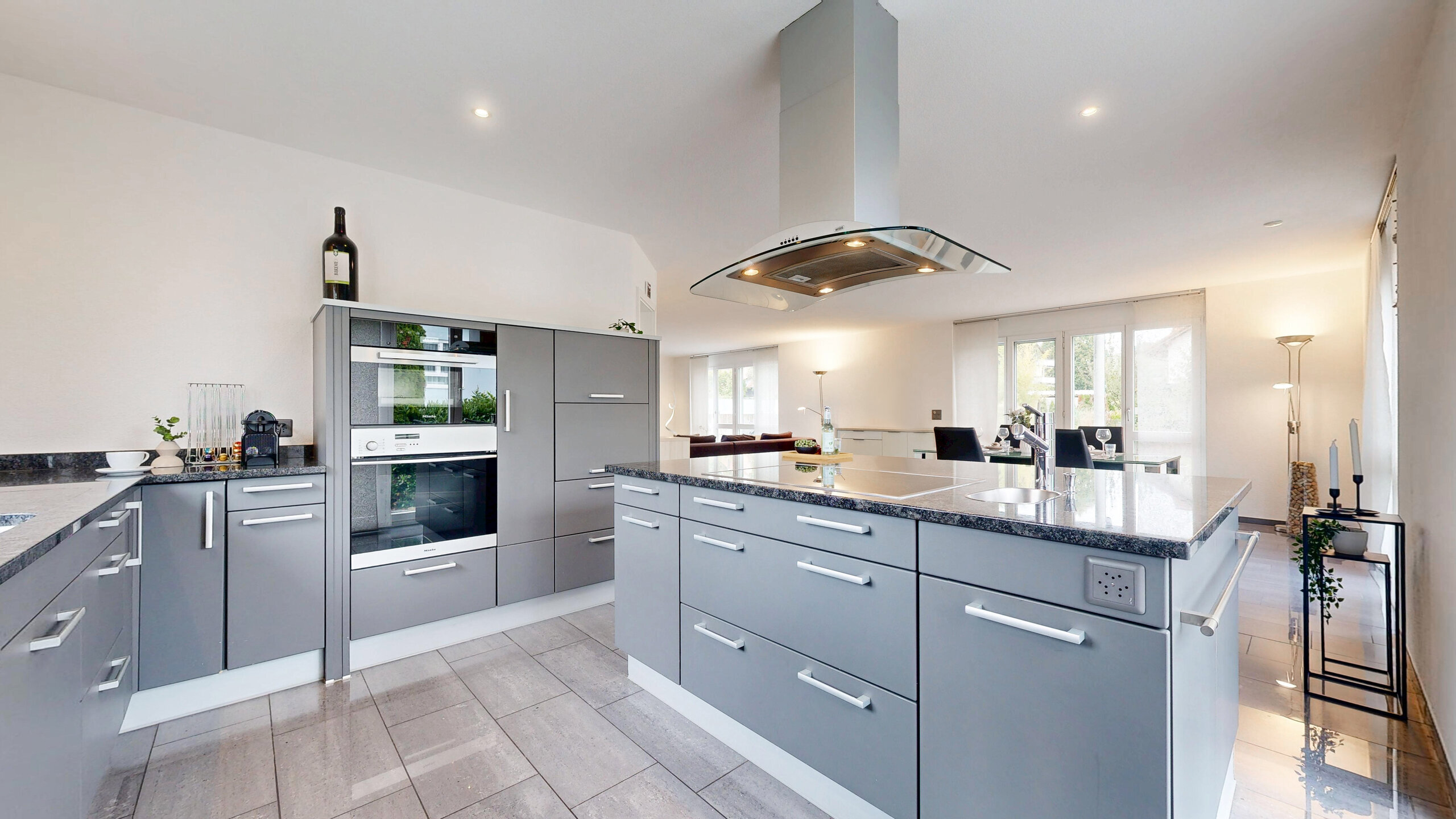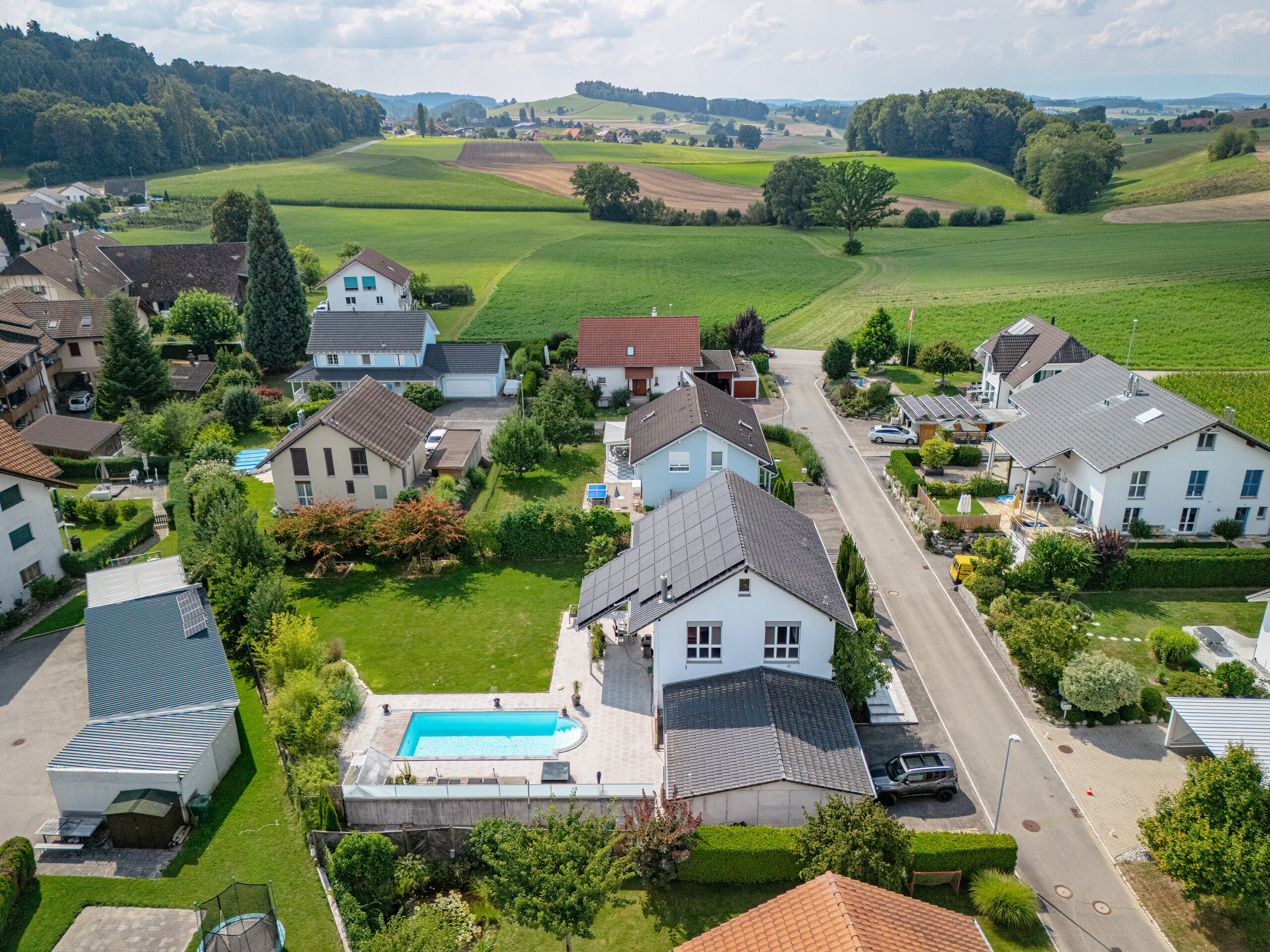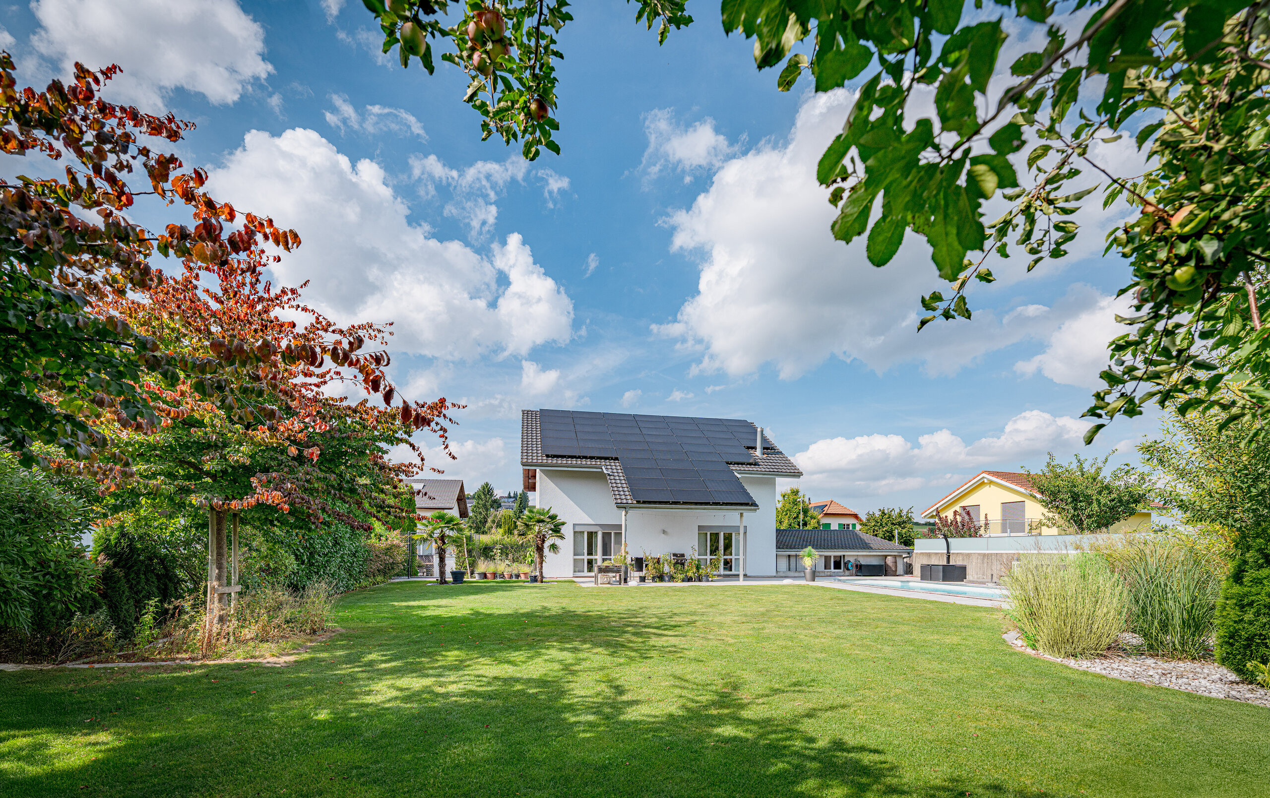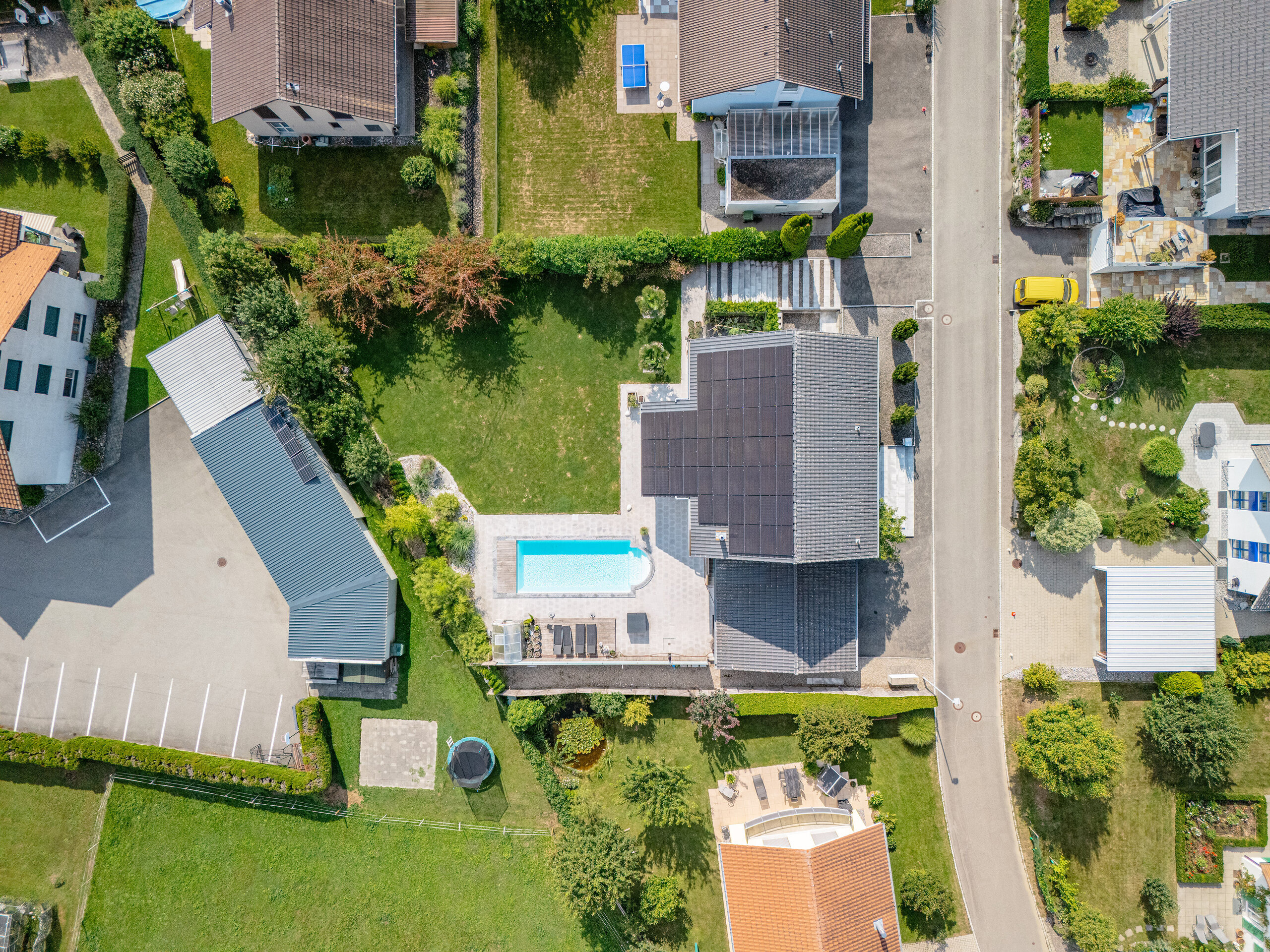 Con oltre 314 m² di superficie utile totale su un generoso lotto di 1'118 m² e 7.5 stanze su tre piani questa casa offre un'impressionante quantità di spazio per una sofisticata casa e vita familiare.L'enorme soggiorno e zona pranzo con le sue grandi finestre offre un ambiente arioso, inondato di luce e crea il luogo perfetto per sentirsi bene.
