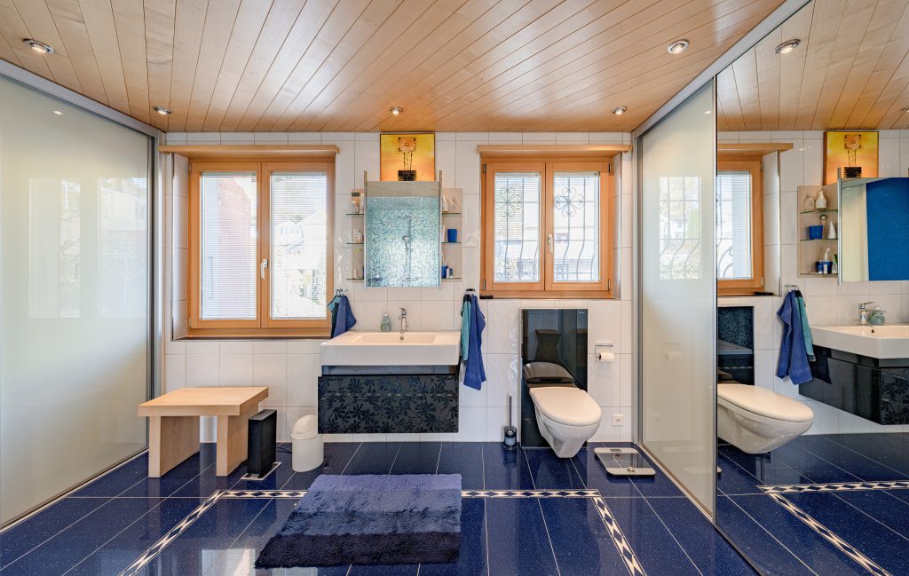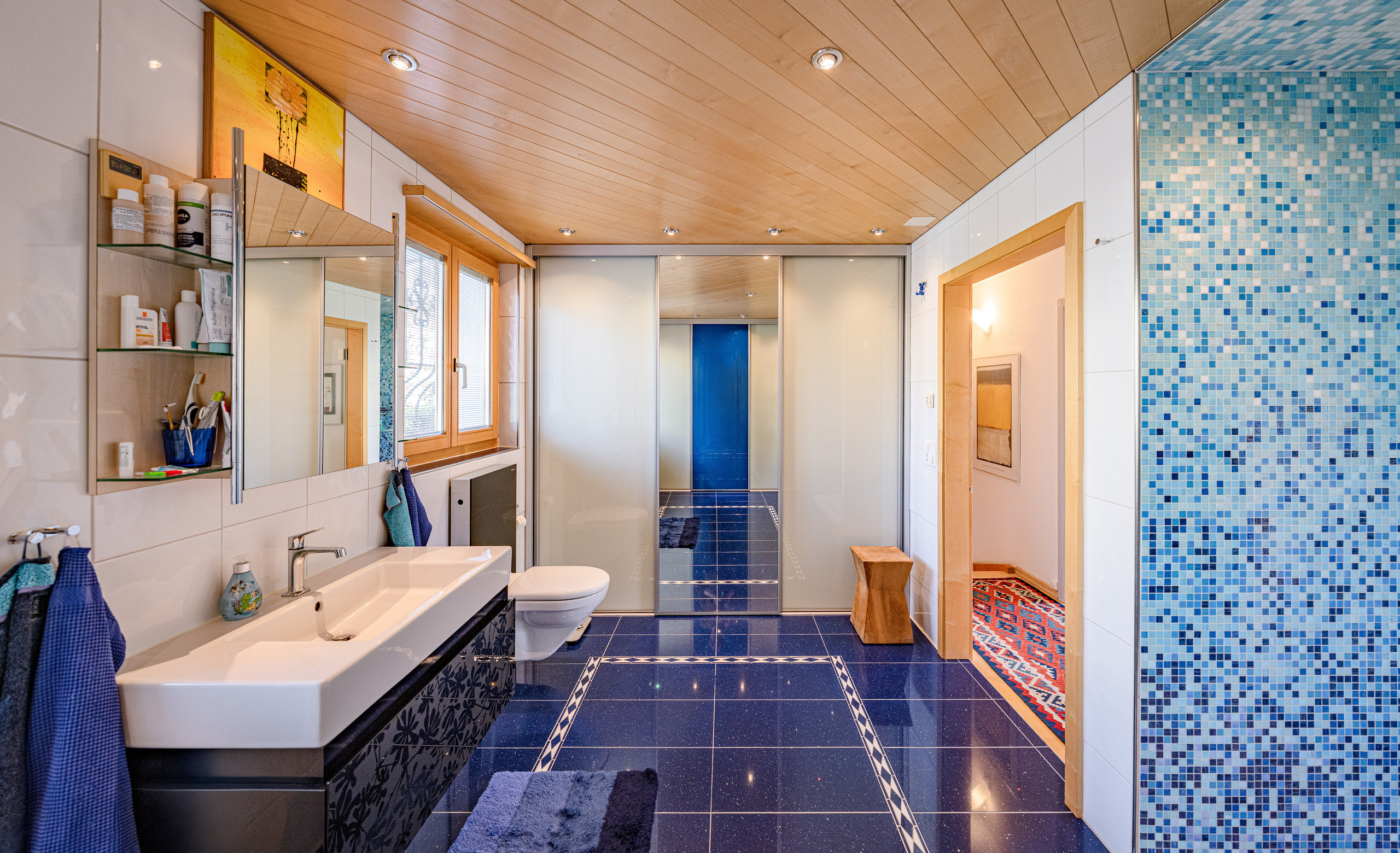 - Bagno: Enorme zona umida con doccia/WC al piano superiore in accattivanti tonalitàblu e grande motivo a mosaico – autentica artigianalità