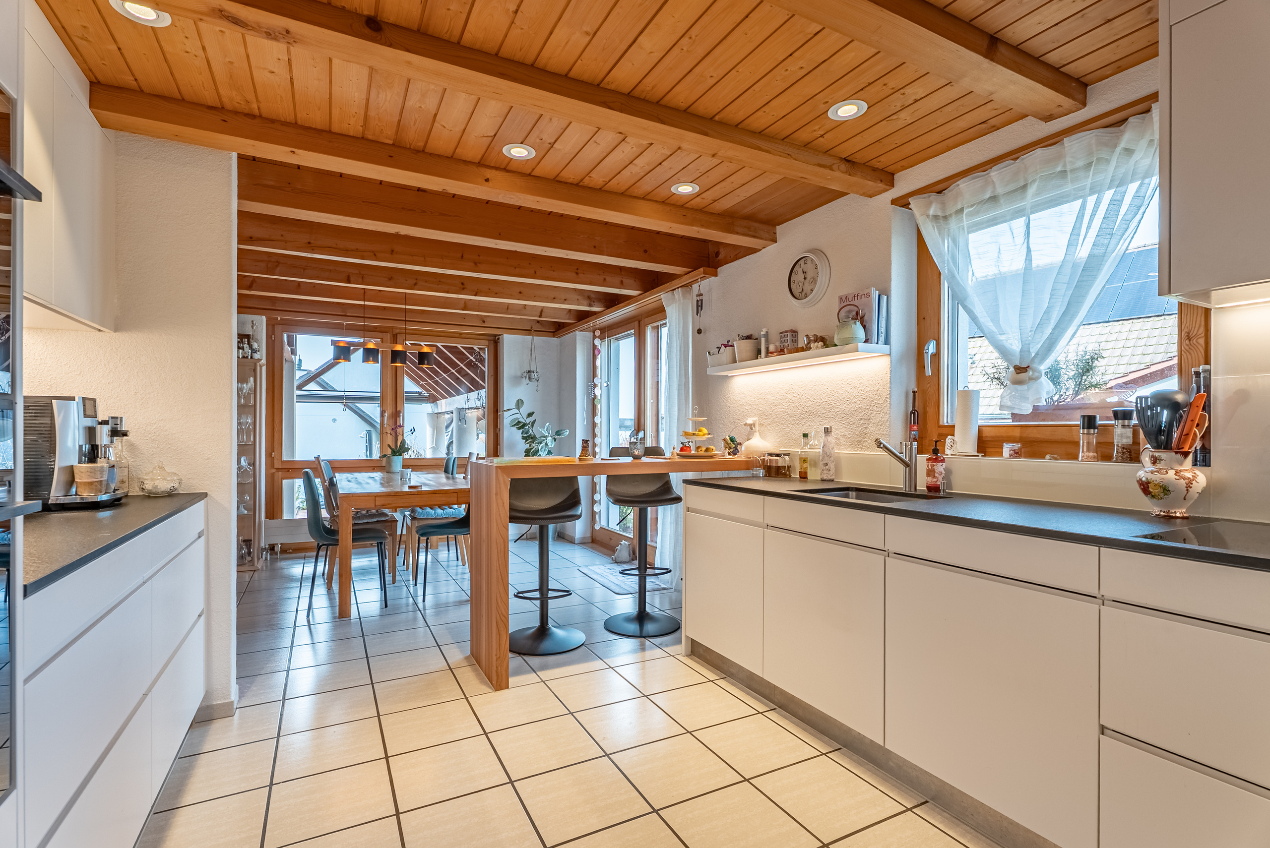 - Cucina aperta di alta qualità, cucina aperta con piano in granito, bancone bar e ampie possibilità di stoccaggio