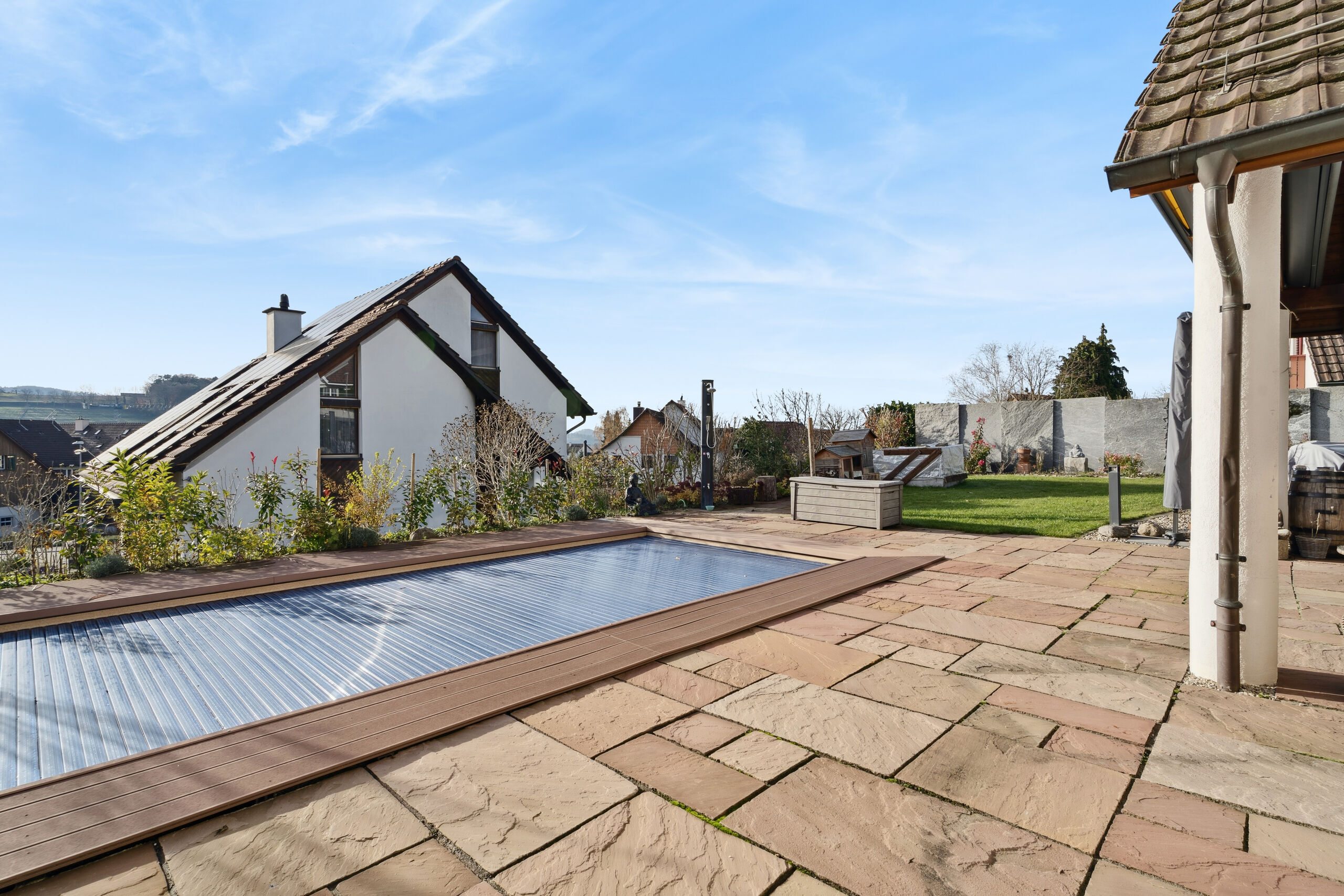 - Attraente area esterna con giardino, Area salotto e piscina con sistema antitempesta – ideale per rilassarsi ore all’aria aperta