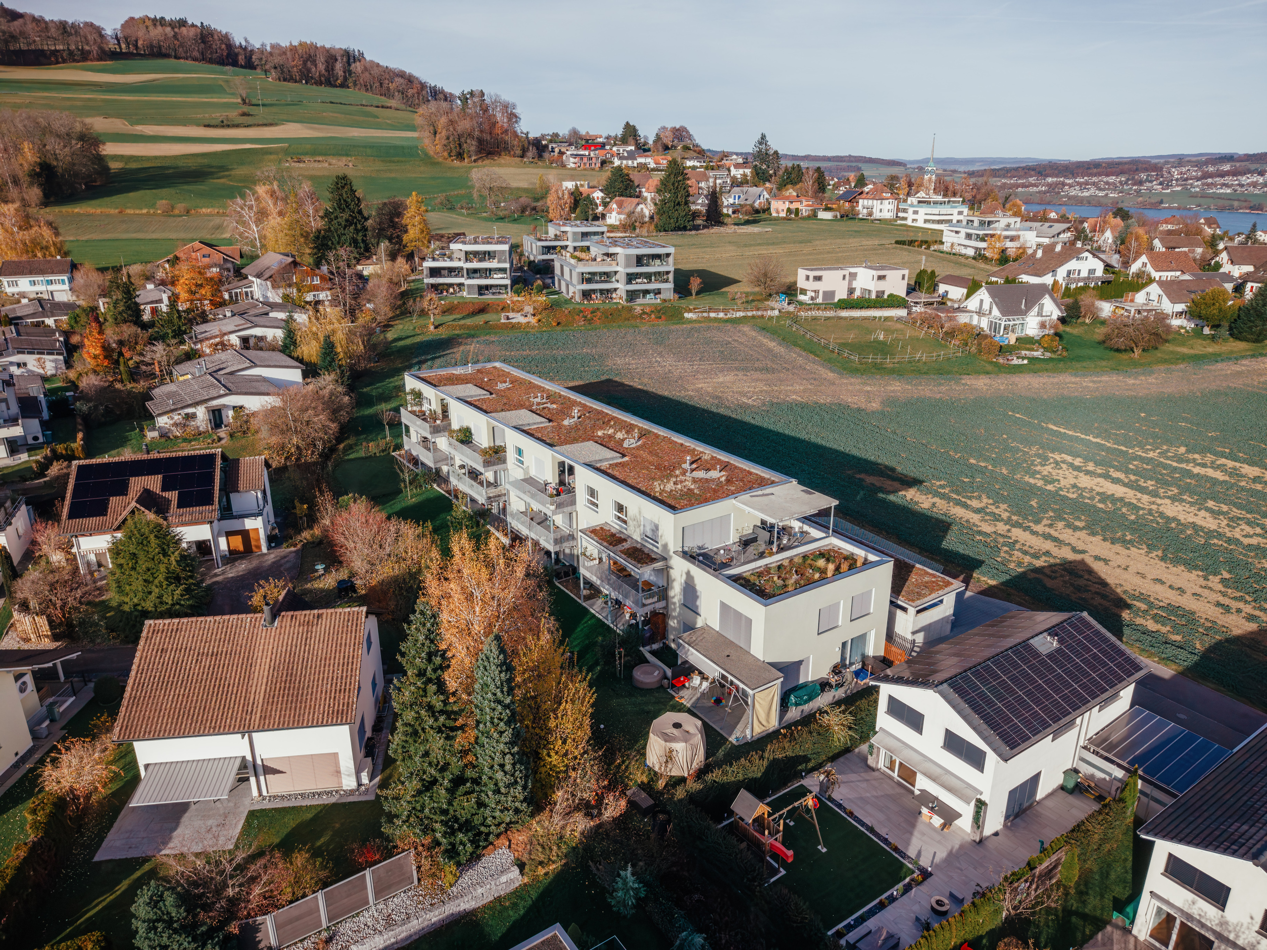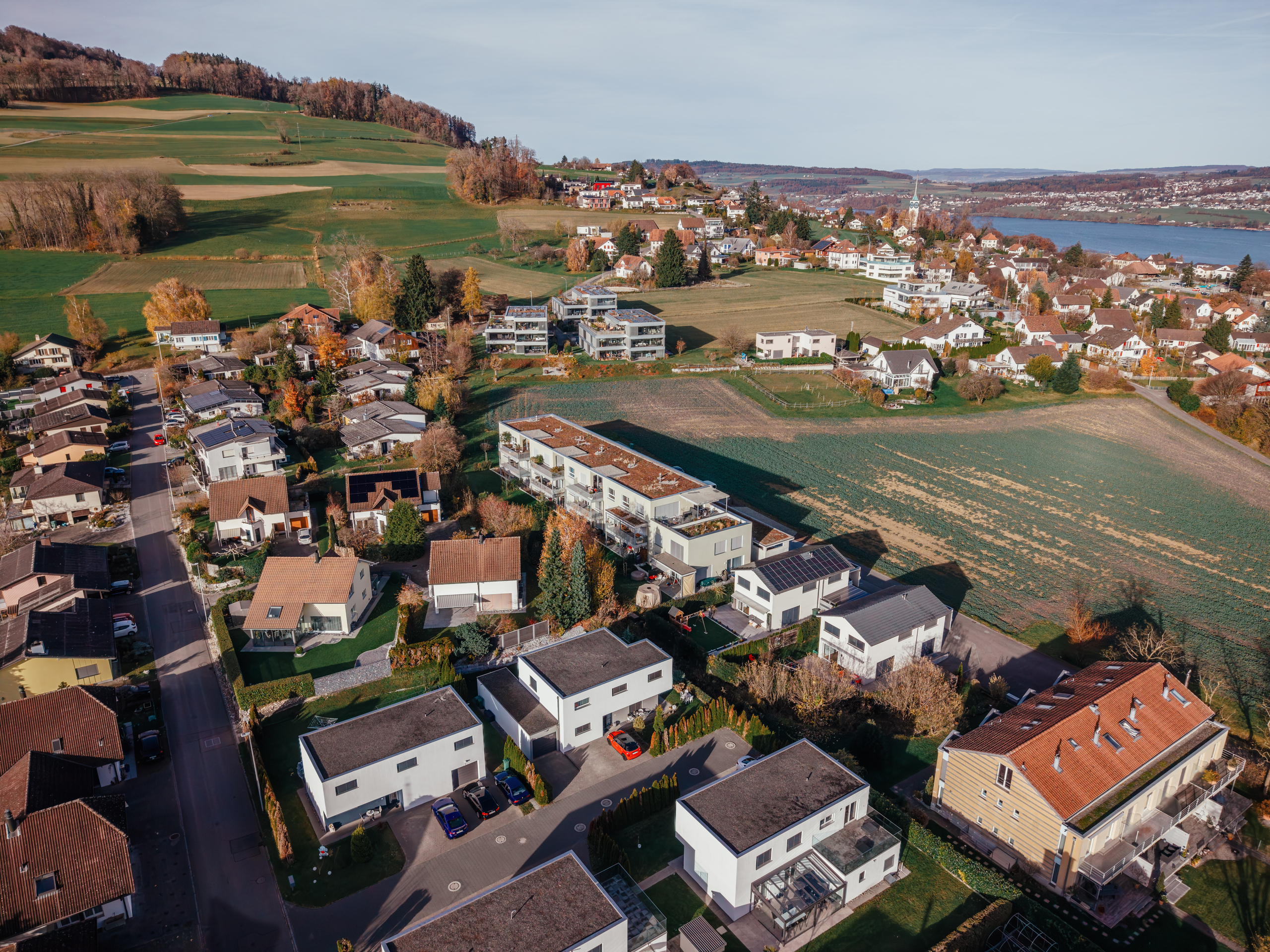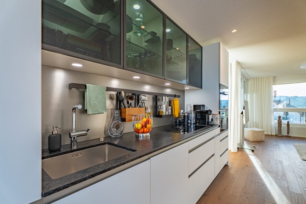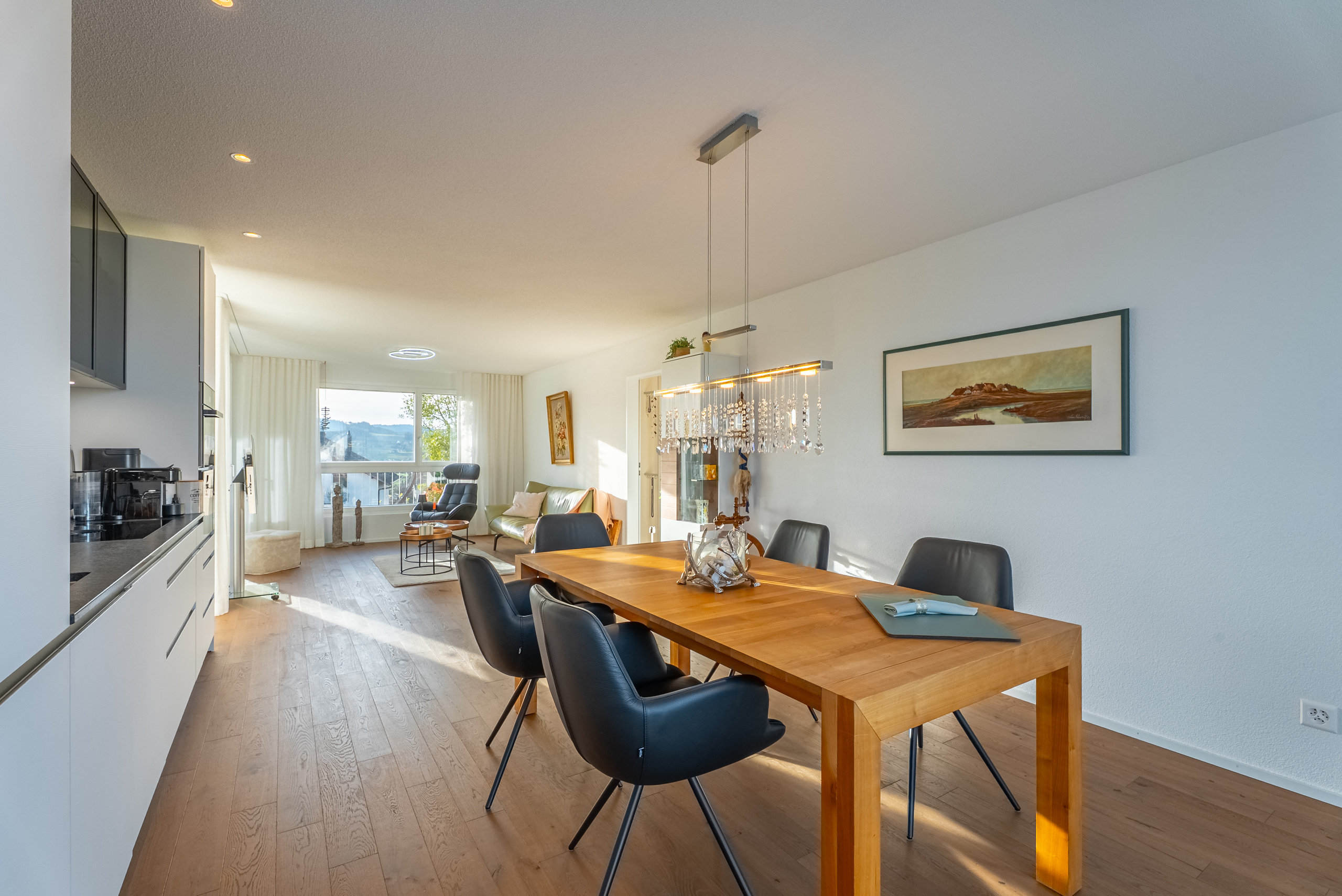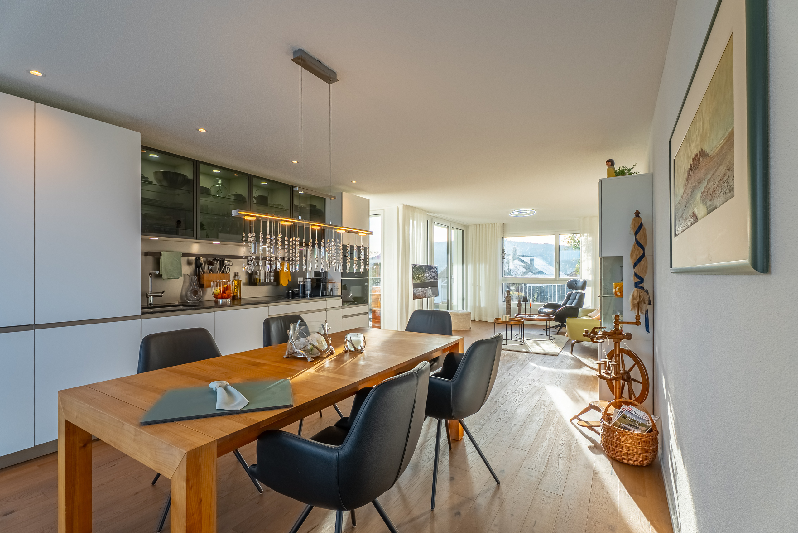 Gli interni sono stati progettati con grande cura : pregiati parquet di rovere, piastrelle in ceramica di alta qualità, bagni eleganti e materiali contemporanei in tutto.Il moderno riscaldamento a sonda geotermica fornisce un calore efficiente e sostenibile.La luminosa zona giorno, cucina e pranzo si estende sull’intera pianta e crea una sensazione di spazio aperto con molta atmosfera.